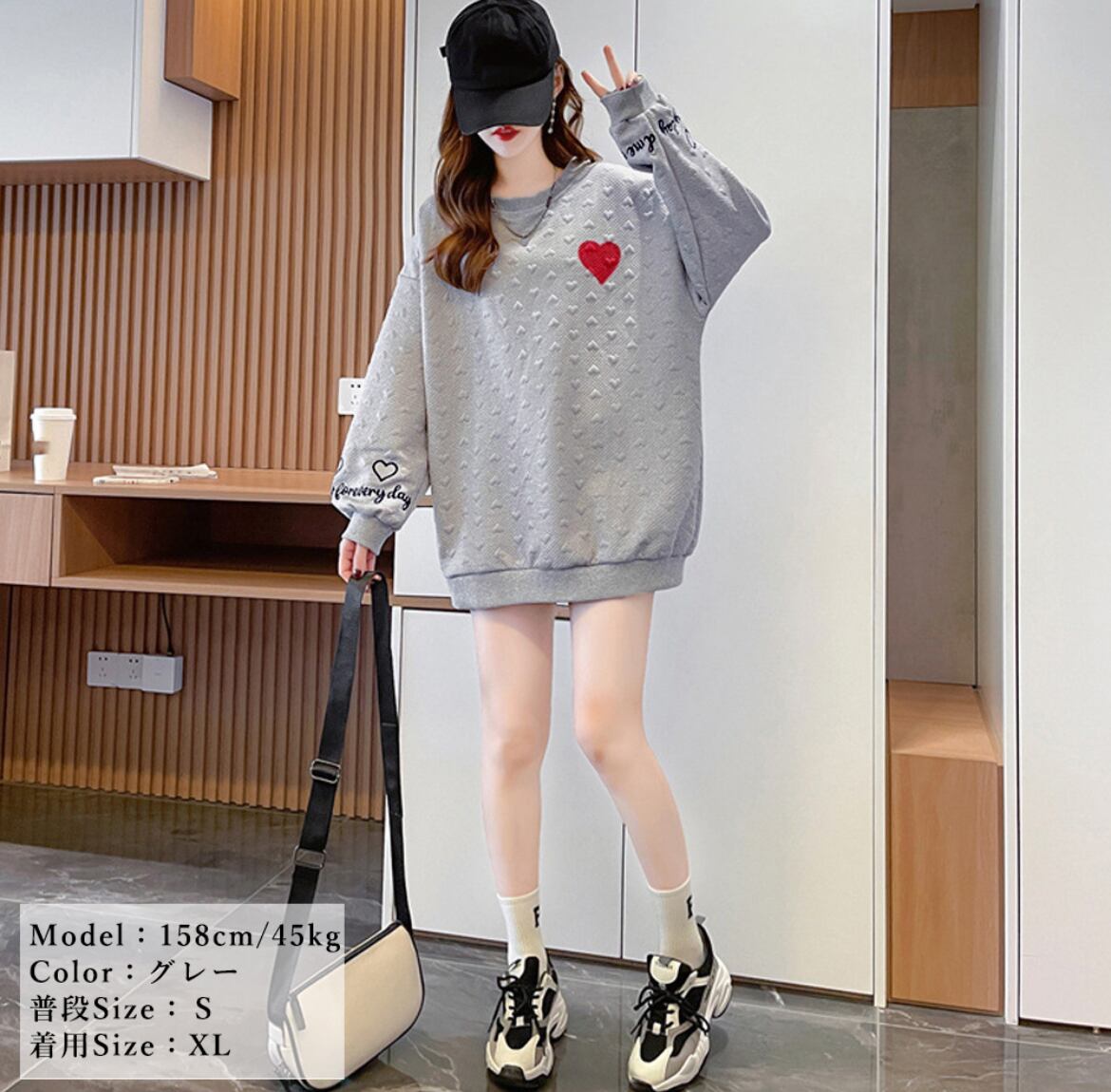 カジュアル ラウンドネック ロゴトレーナー エンボス加工 長袖プルオーバー ハート刺しゅう 体型カバー ロンT 春秋服