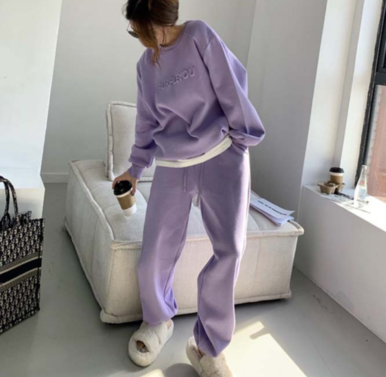 柔らかで心地よい素材を使用したこのスウェット&パンツセットは、ラフな着心地ながらもスタイリッシュな印象を与え、春の快適スタイルを演出します。